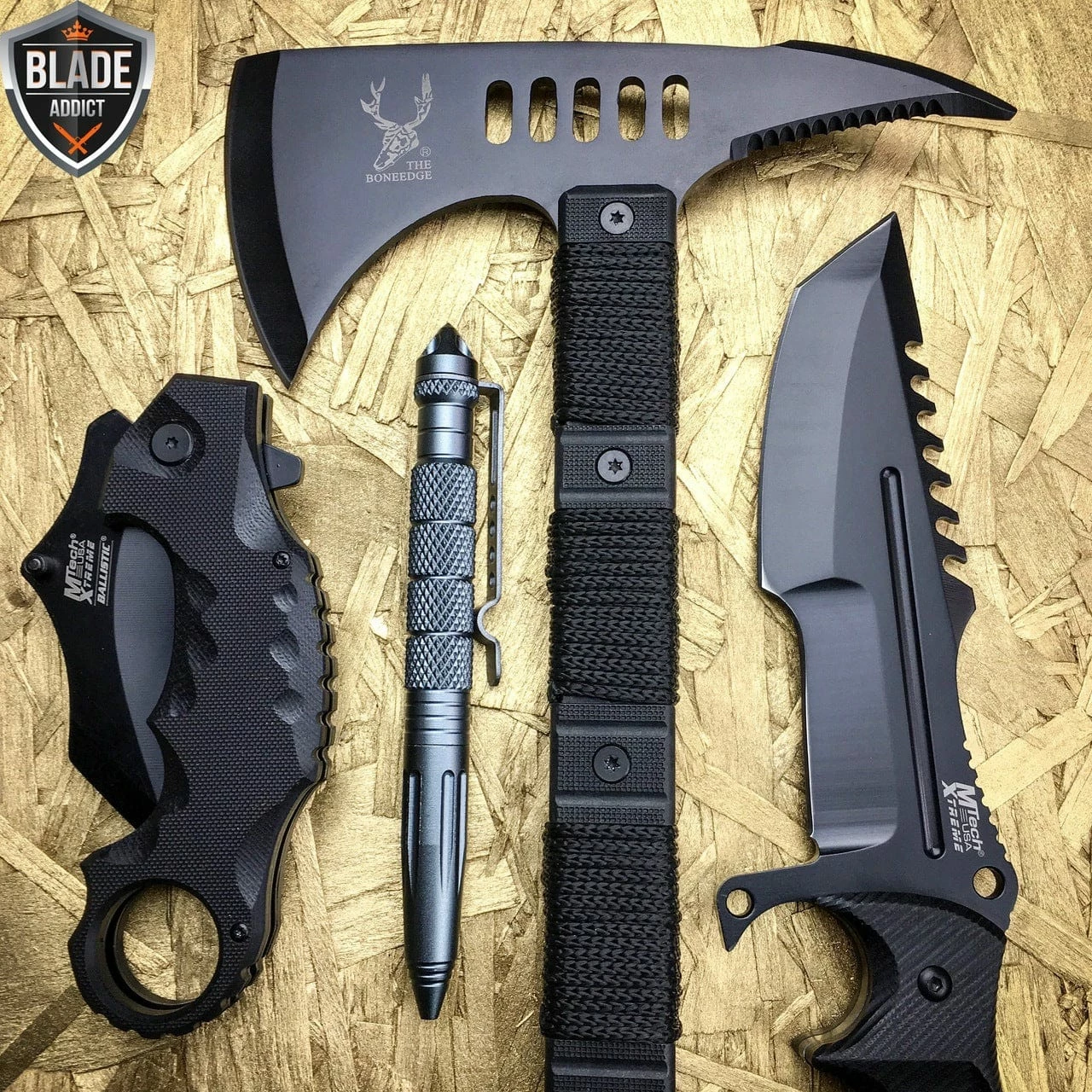- Comes with Tomahawk Axe, Tactical Pen, Huntsmen Knife, Karambit Pocket Knife