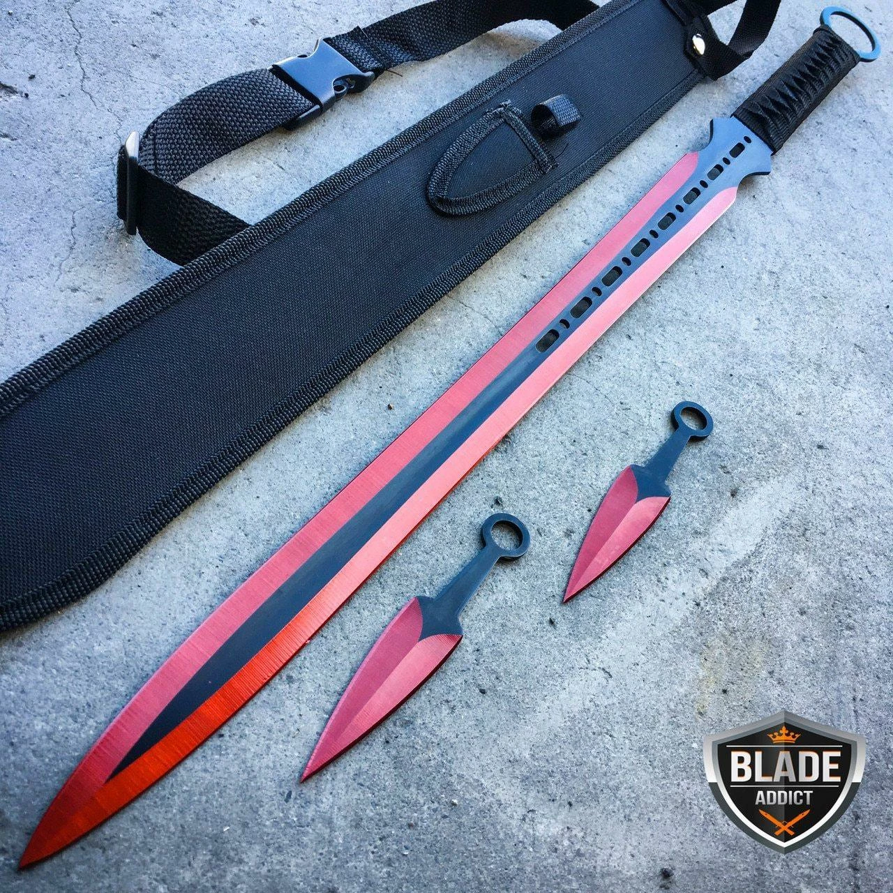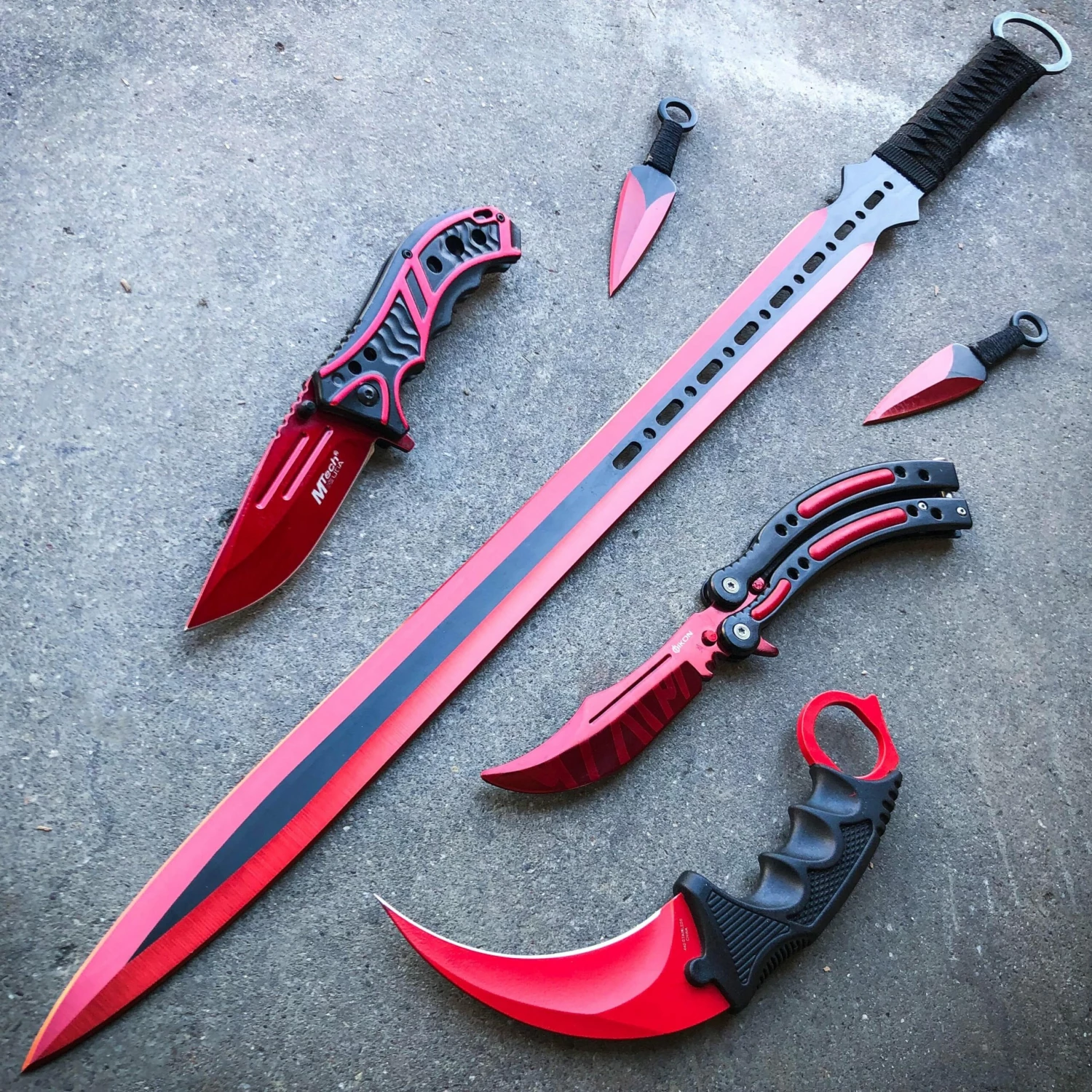 - Comes with Sword, 2 Throwing Knives, Karambit, Spring Assisted Pocket Knife, Balisong Trainer