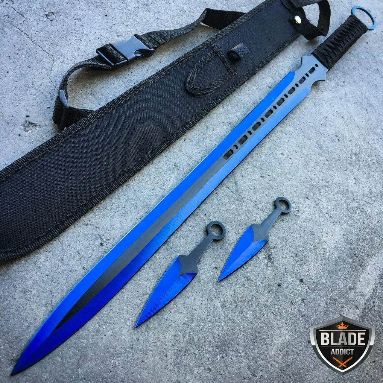 - Comes with Sword, 2 Throwing Knives, Karambit, Fixed Blade, Spring Assisted Pocket Knife, Balisong Trainer