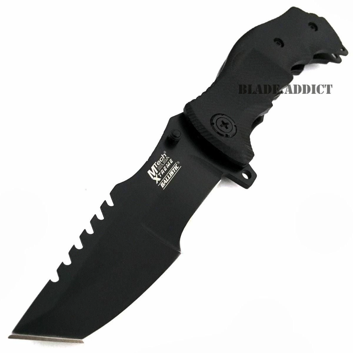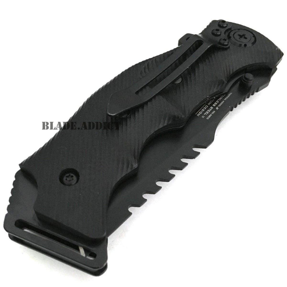 Tanto blades are meant to be strong so they can force their way into places that other knives may not be able to. This tanto blade spring assisted pocket knife is four inches long and has a saw back to make sure you can resolve any problem at all. This blade is a stainless steel that has been plated with a gold titanium. The handle is black with a diagonal striped pattern and a black pocket clip to prevent this knife from falling out of your pocket.