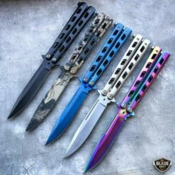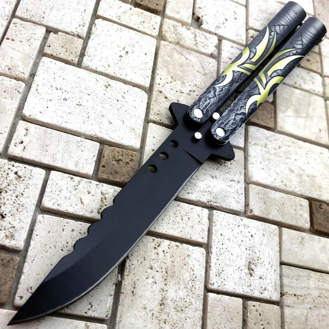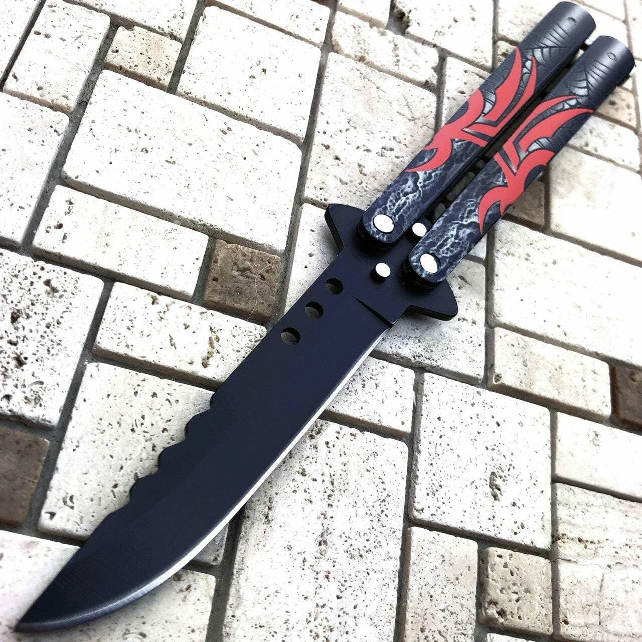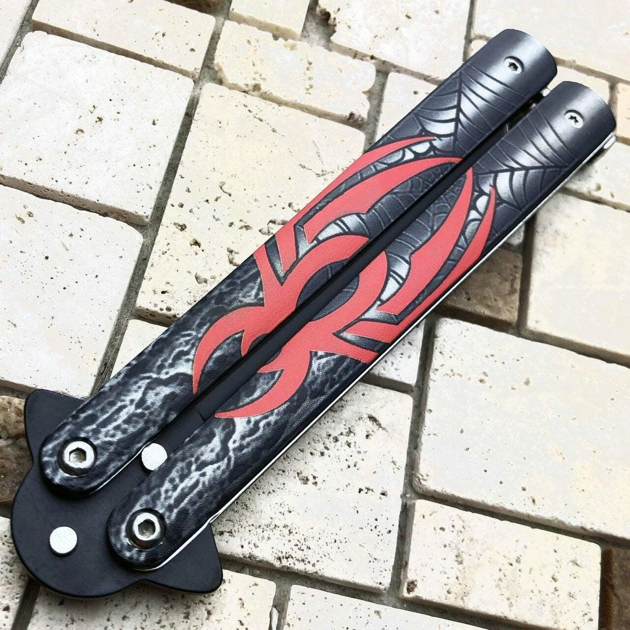 Show off your new tricks with this spider balisong. It comes with a razor sharp blade and can be easily flipped open with either of its handles. Comes with a black blade and latch lock to keep your handles closed.